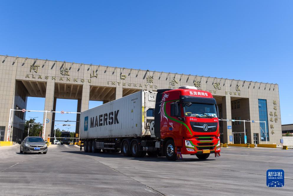 一辆满载货物的货车驶出新疆阿拉山口综合保税区(7月24日摄)。