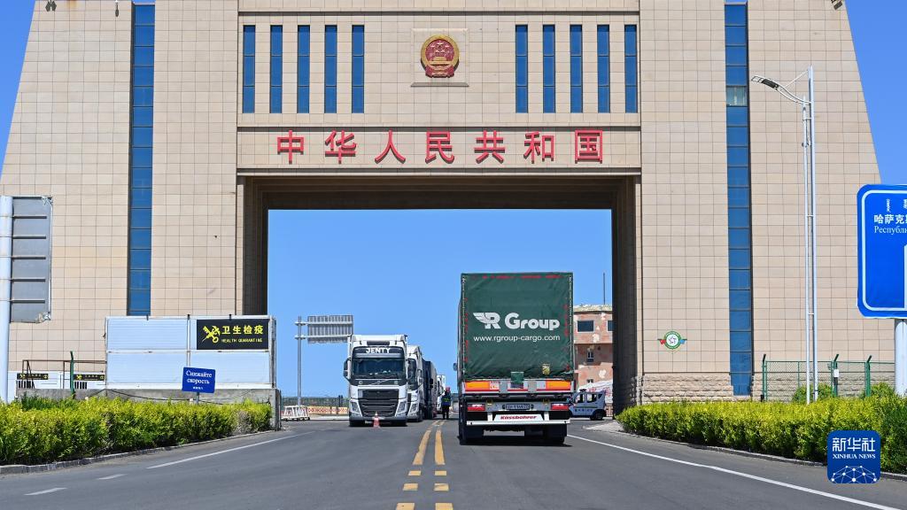 在新疆阿拉山口口岸,几辆货车在进出国门(7月24日摄)。