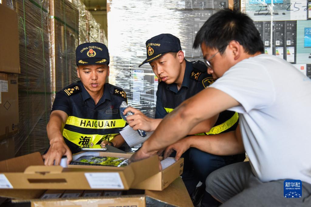 在新疆阿拉山口综合保税区内的跨境电子商务分拣清关中心,海关工作人员在查验货物(7月24日摄)。