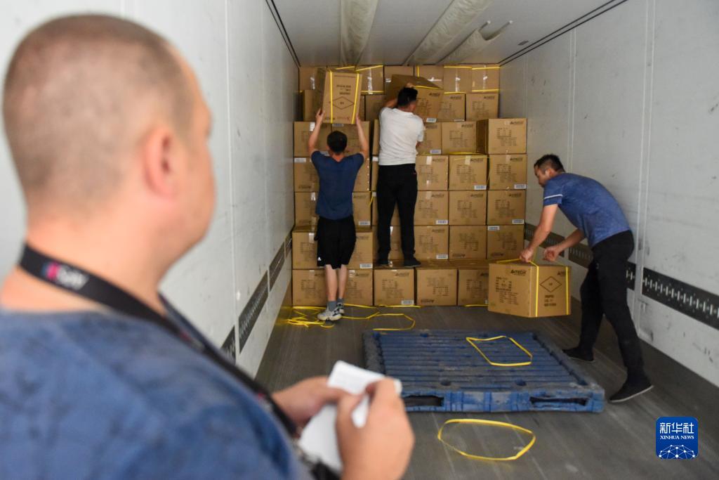 在新疆阿拉山口综合保税区内的跨境电子商务分拣清关中心,工作人员将货物装车(7月24日摄)。