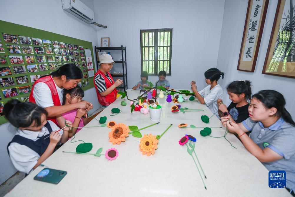7月25日,在诸暨市马剑镇上和村的侯门山乡村图书馆,暑托班的孩子们在志愿者老师的带领下学习用毛线编织钩织花。