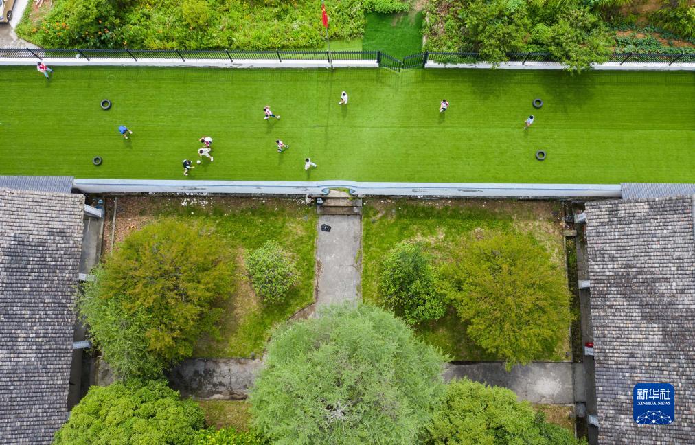7月25日,在诸暨市马剑镇上和村的侯门山乡村图书馆,暑托班的孩子们在参加体育比赛(无人机照片)。