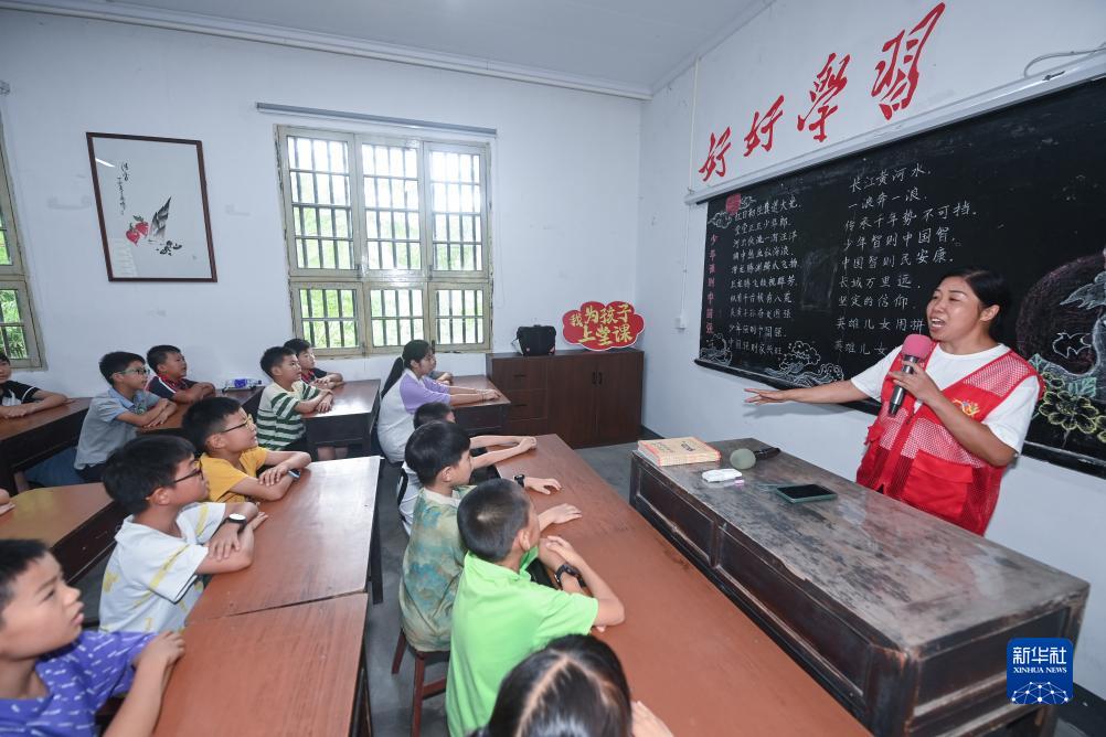 7月25日,在诸暨市马剑镇上和村的侯门山乡村图书馆,暑托班的孩子们在志愿者老师的带领下学习歌曲。