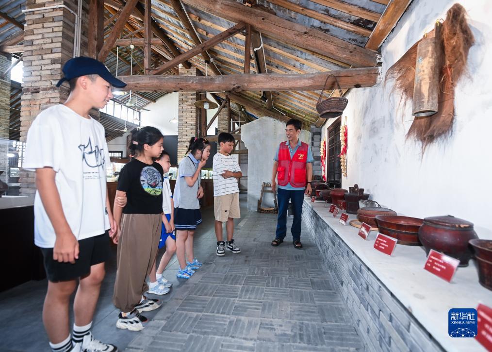 7月25日,在诸暨市马剑镇状元村,志愿者给暑托班的孩子们介绍村博物馆里的各类传统用具。