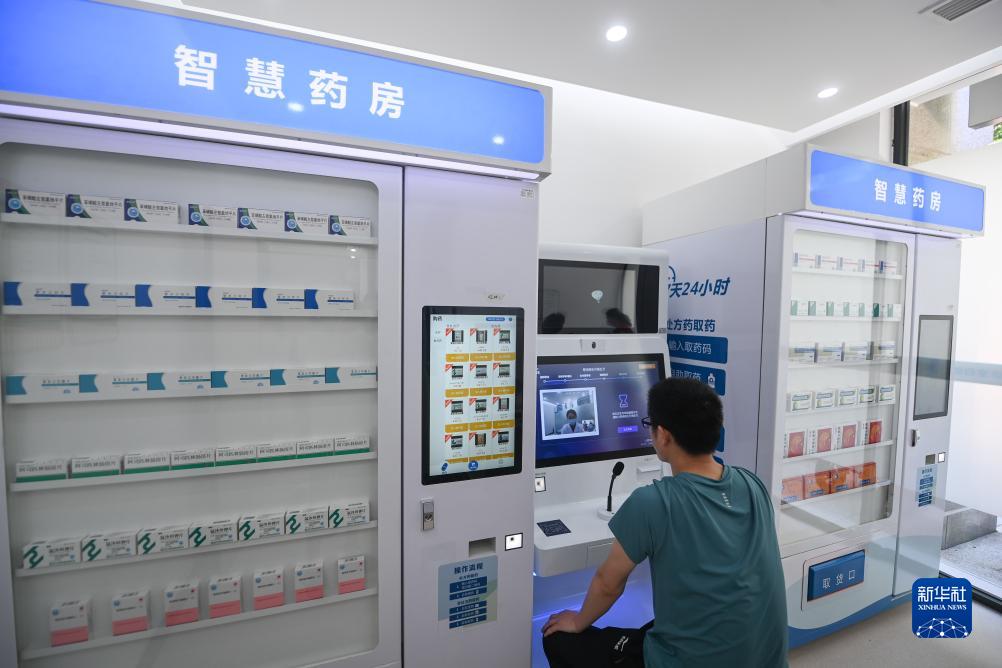 7月25日,居民在诸暨市浣东街道东盛社区卫生服务站的智慧药房内进行远程问诊,问诊完毕后可以开具处方并配好日常用药。