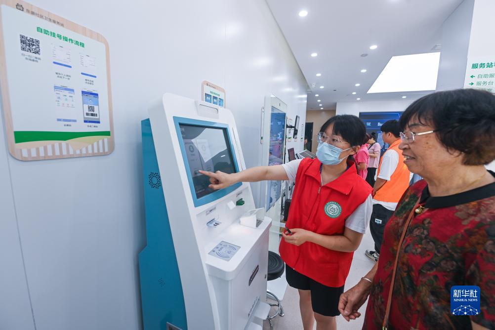 7月25日,在诸暨市浣东街道东盛社区卫生服务站内,志愿者在指导居民使用自助设备。
