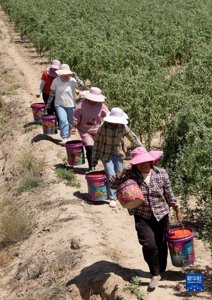 7月21日,采摘女工在中卫市沙坡头区兴仁镇搬运枸杞。