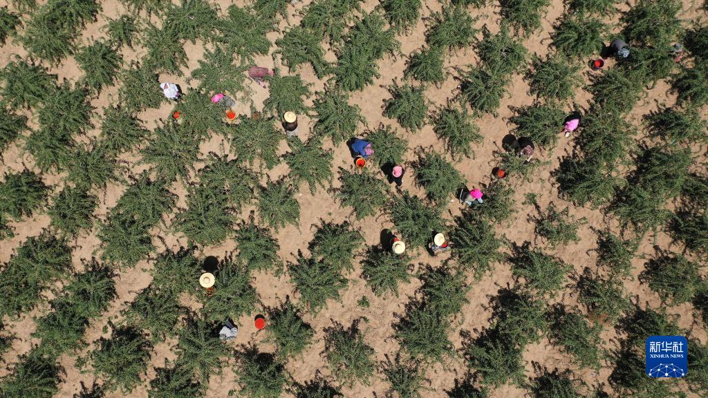 7月21日,采摘工在中卫市沙坡头区兴仁镇中卫市杞园春枸杞种植农民专业合作社枸杞种植基地采摘枸杞(无人机照片)。