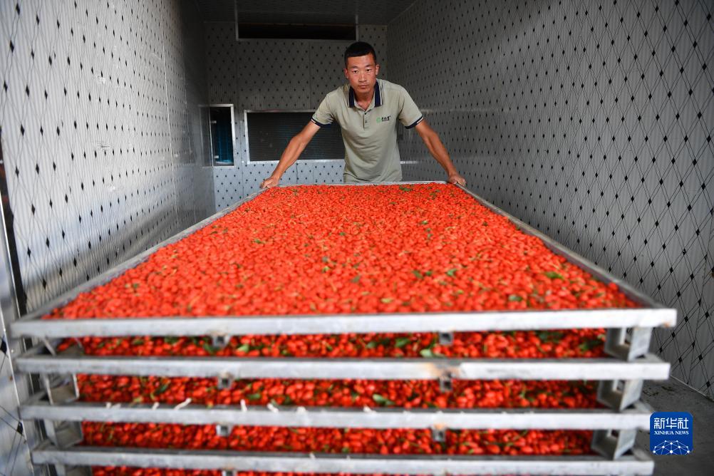 7月21日,中卫市沙坡头区兴仁镇中卫市杞园春枸杞种植农民专业合作社的工作人员准备将鲜枸杞进行烘干处理。