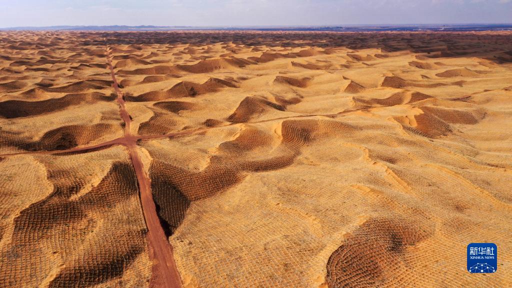 位于宁夏中卫市境内腾格里沙漠的草方格治沙区(7月19日摄,无人机照片)。宁夏中卫市是草方格沙障的起源地,该技术由中国科学院沙坡头沙漠研究试验站同中卫铁路固沙林场职工、当地群众经过多年的探索和实践总结而成。