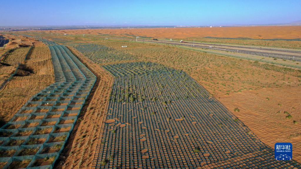 乌玛高速青铜峡至中卫段穿越腾格里沙漠的18公里高速公路旁的草方格固沙区及防护林带(7月21日摄,无人机照片)。宁夏中卫市是草方格沙障的起源地,该技术由中国科学院沙坡头沙漠研究试验站同中卫铁路固沙林场职工、当地群众经过多年的探索和实践总结而成。