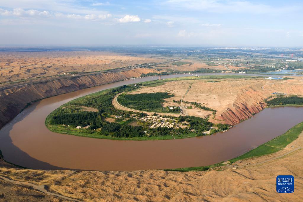 7月19日拍摄的植被覆盖的中卫市黄河沿岸(无人机照片)。