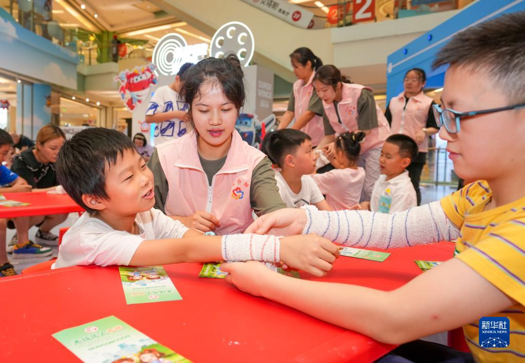 7月25日,在重庆市九龙坡区杨家坪街道一商场的预防溺水安全教育社区服务点,青少年在巾帼志愿者的指导下体验简易包扎技能。