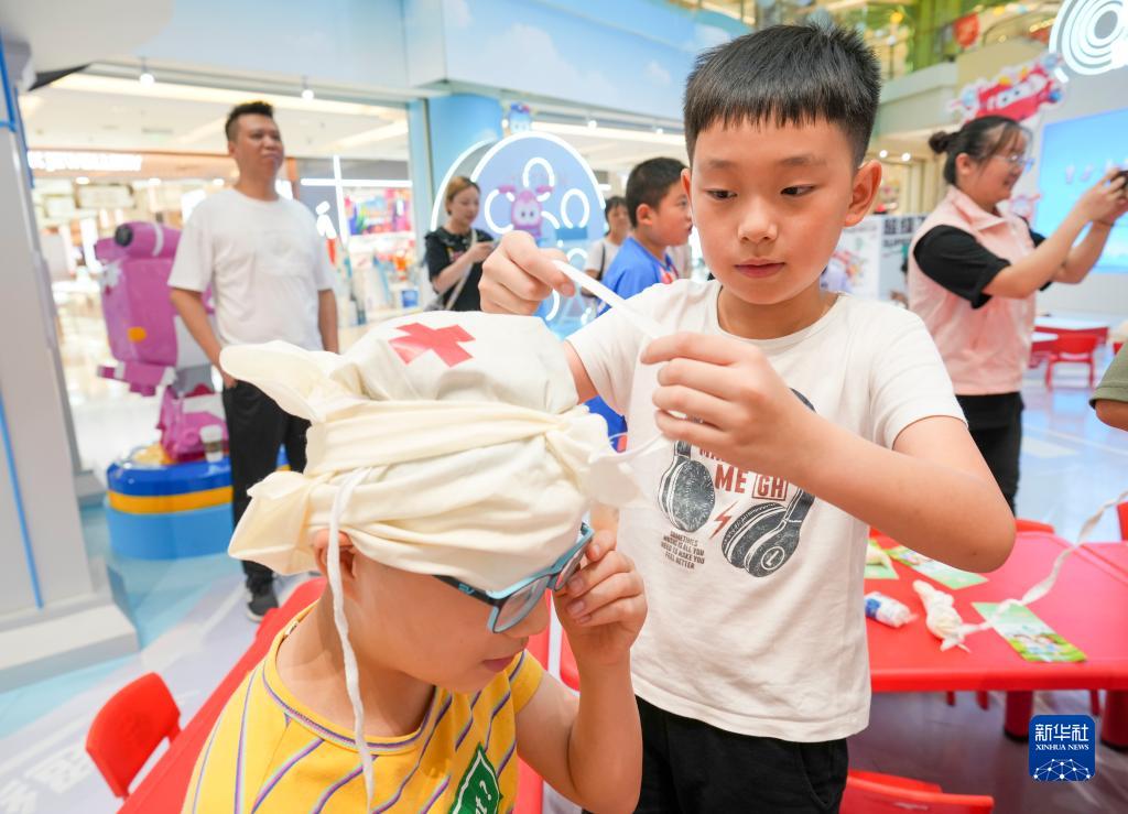 7月25日,在重庆市九龙坡区杨家坪街道一商场的预防溺水安全教育社区服务点,一名小男孩在练习简易包扎技能。