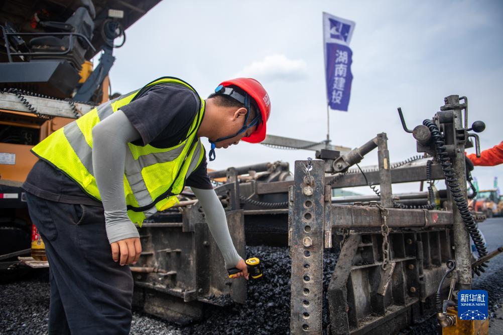 7月25日,在衡永高速路面工程施工现场,工人在测量沥青温度。