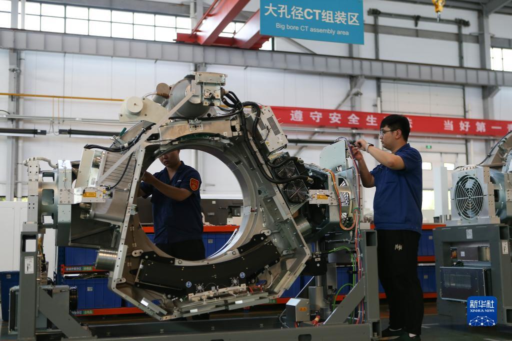 7月25日,在位于淄博市高新区的山东新华医疗器械股份有限公司,工作人员在车间组装医疗设备。