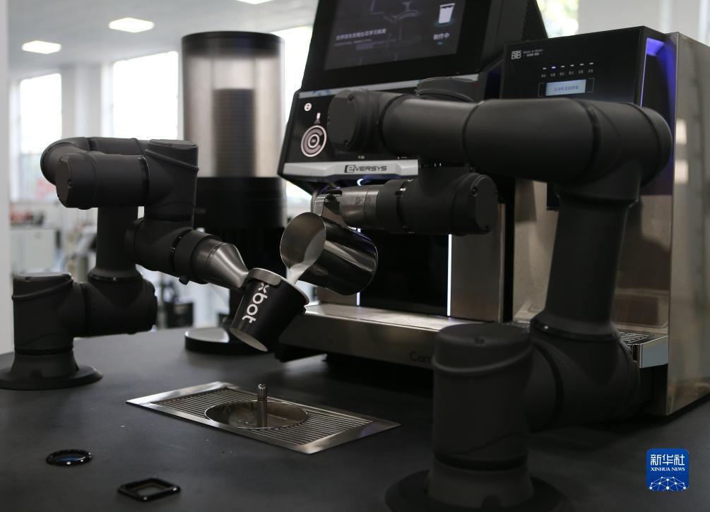 7月25日,在位于淄博市临淄区的遨博(山东)智能机器人有限公司,机器人在制作咖啡。