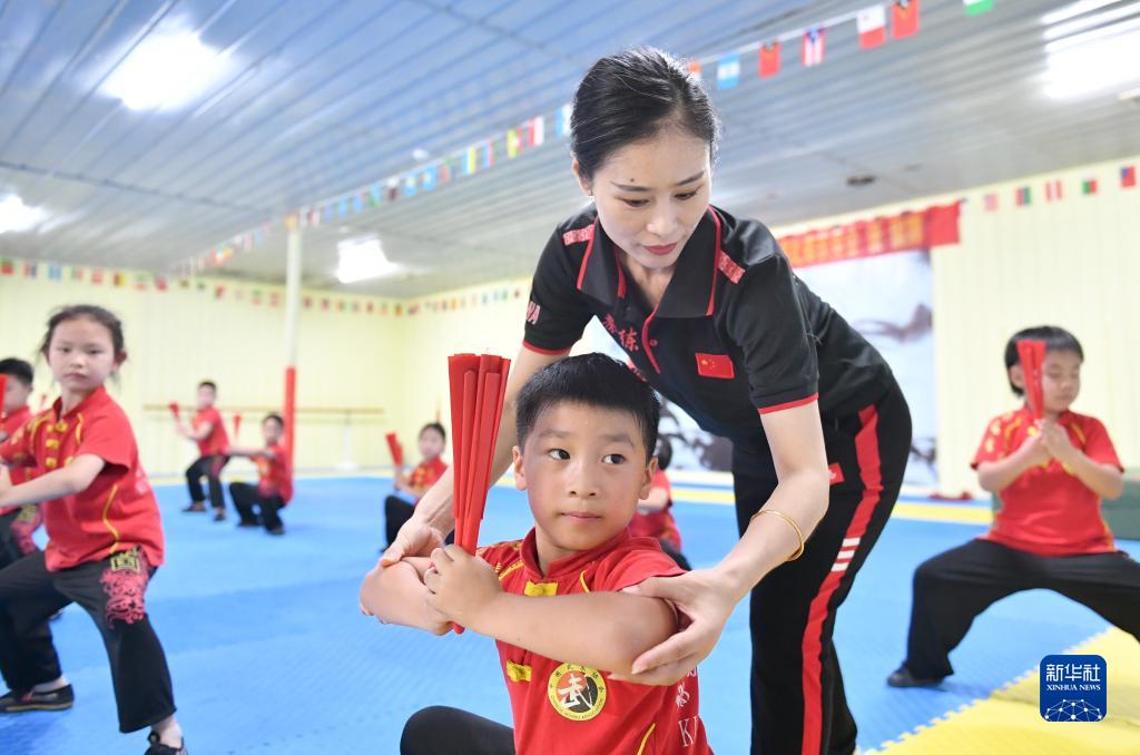 7月25日,在河南省夏邑县静武堂,学生在老师的指导下练习武术。新华社发(苗育才 摄)