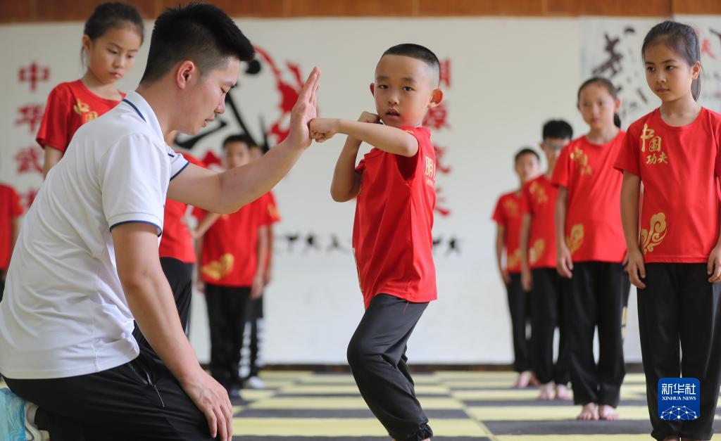 7月25日,在贵州省开阳县一家武术培训中心,孩子们在老师的指导下学习武术基本动作。新华社发(袁福洪 摄)