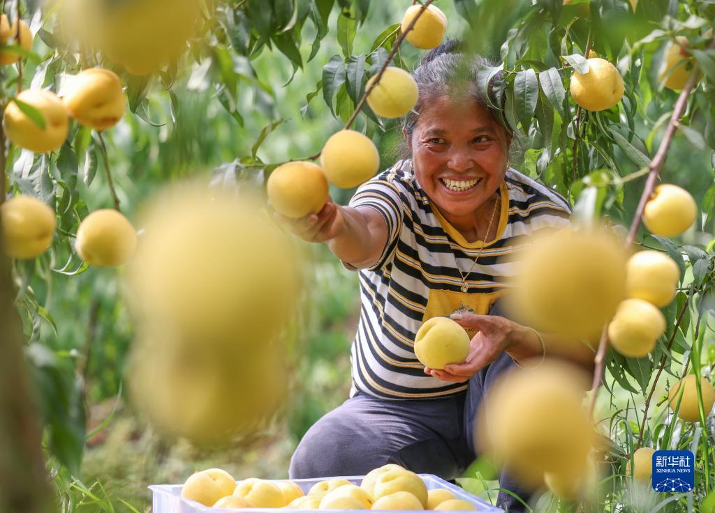 7月25日,果农在贵州省玉屏侗族自治县朱家场镇混寨村黄桃基地采摘黄桃。新华社发(胡攀学 摄)