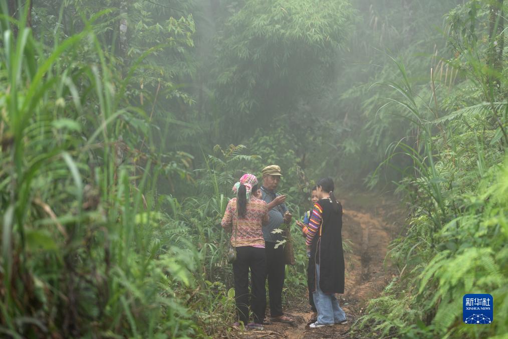 7月23日,张普忠(左二)在树林中边走边说,向孩子们介绍野果、草药等知识。新华社记者 费茂华 摄