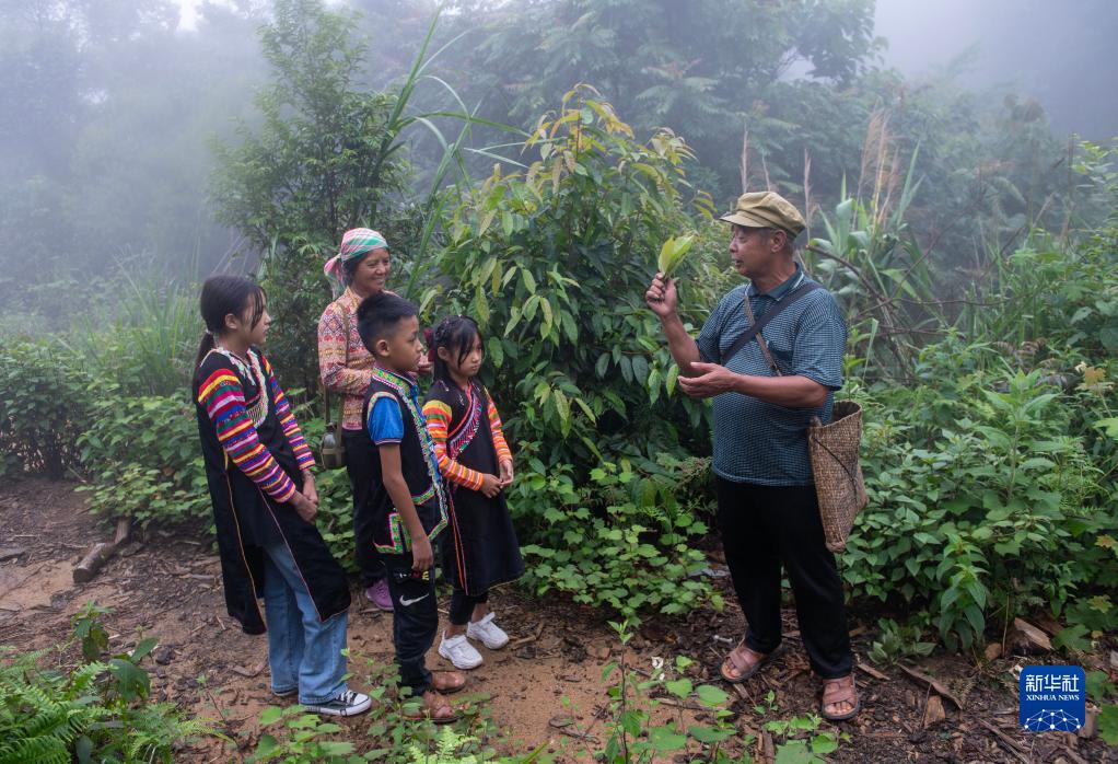 7月23日,张普忠(右一)在丛林中为孩子们介绍草药。新华社记者 陈欣波 摄
