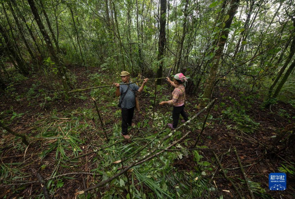 7月23日,张普忠(左)和老伴王素英在搭建芭蕉叶棚子。新华社记者 费茂华 摄