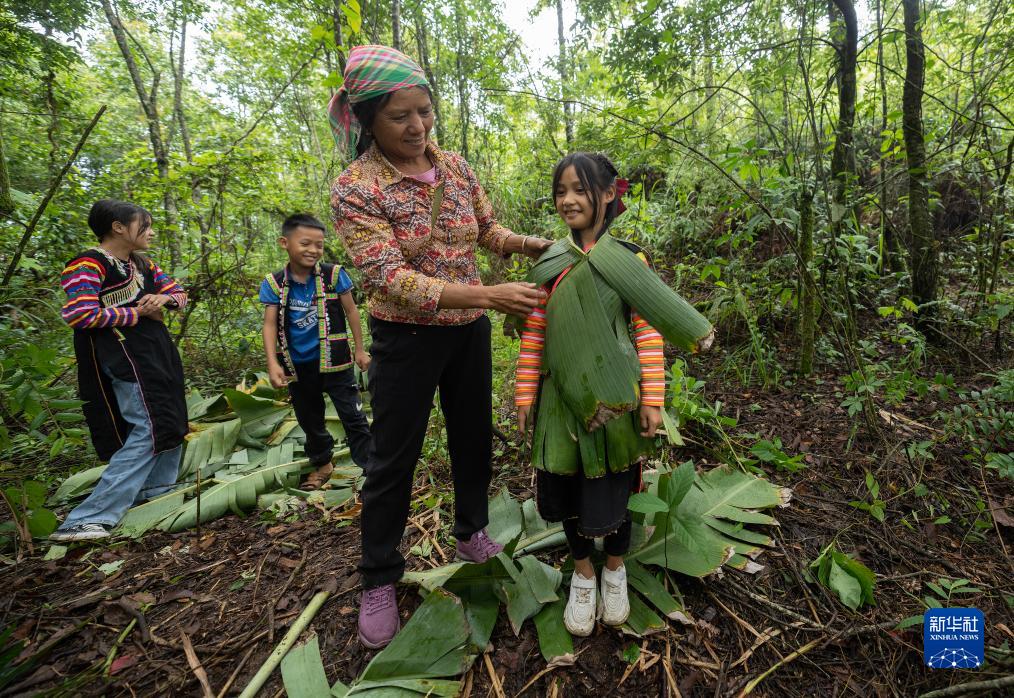 7月23日,张普忠的老伴王素英(右二)用芭蕉叶为小孙女张丽红制作“衣服”。新华社记者 费茂华 摄