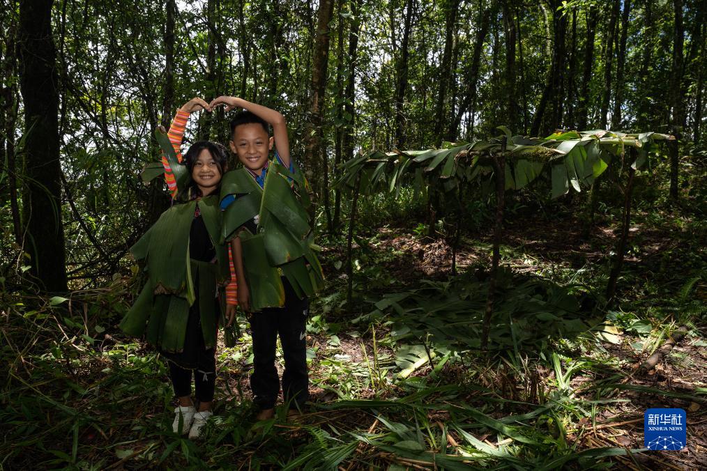 7月23日,张普忠的小孙女张丽红和孙子张伟军穿着芭蕉叶“衣服”在芭蕉叶棚子前留影。新华社记者 费茂华 摄