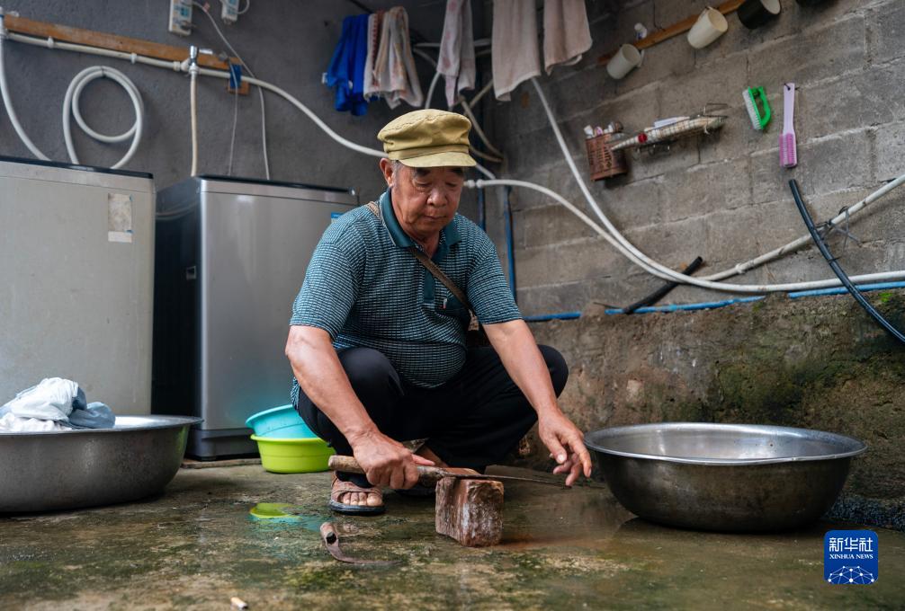 张普忠在家中院子里磨刀为上山做准备(7月23日摄)。新华社记者 陈欣波 摄