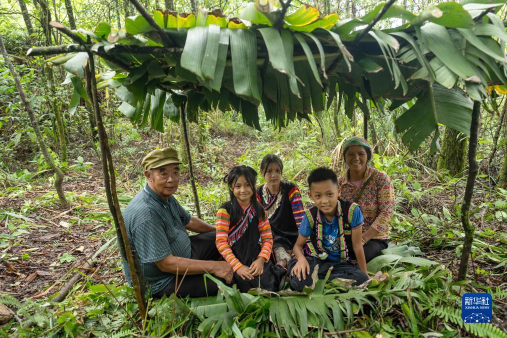 7月23日,张普忠和家人在芭蕉叶棚子里合影,从左至右为张普忠、小孙女张丽红、大孙女张英、孙子张伟军和老伴王素英。新华社记者 费茂华 摄