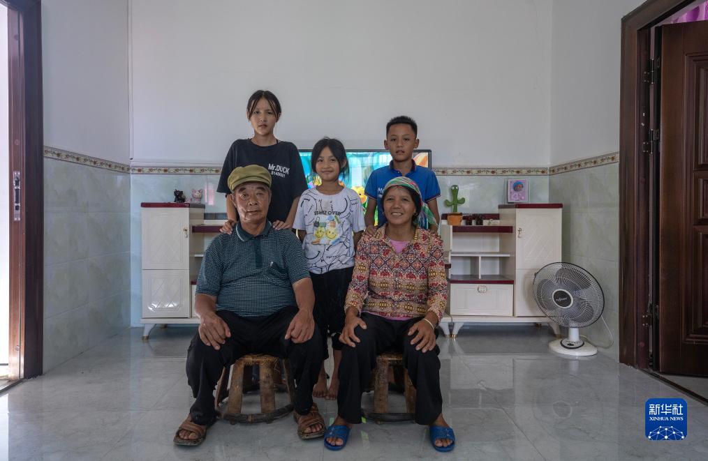7月23日,张普忠(前左)、老伴王素英(前右)、大孙女张英(后左)、孙子张伟军(后右)和小孙女张丽红(中)在新居中合影。新华社记者 费茂华 摄