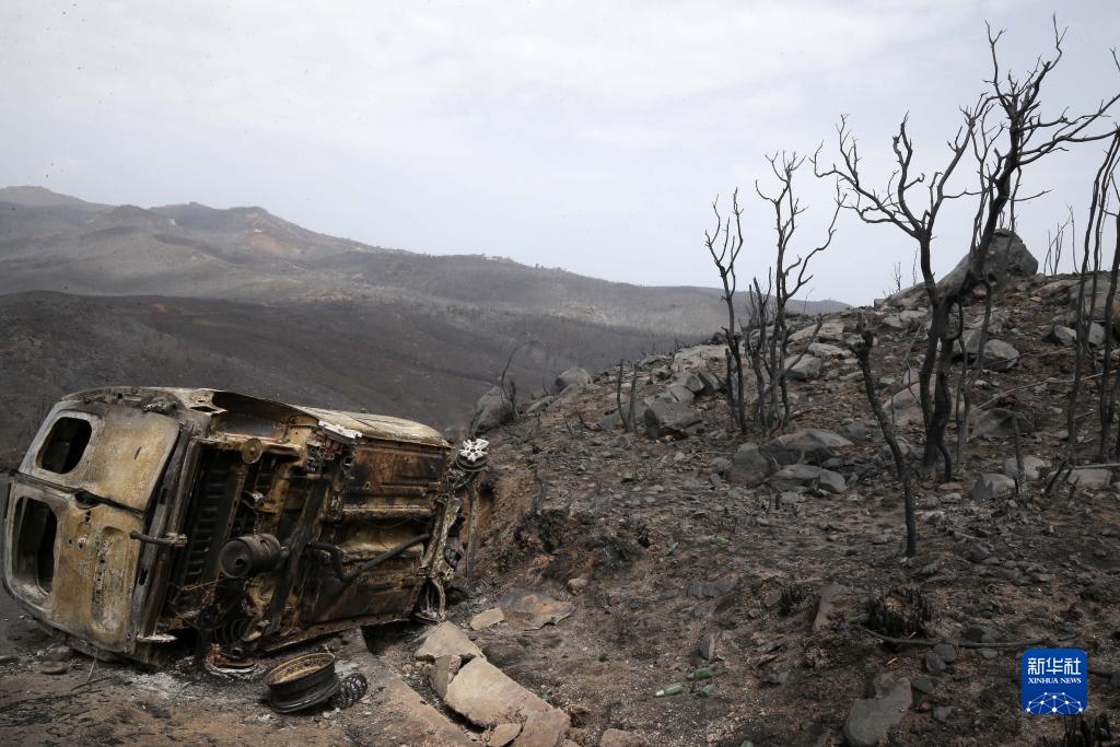 这是7月25日在阿尔及利亚贝贾亚省拍摄的被野火烧毁的车辆。