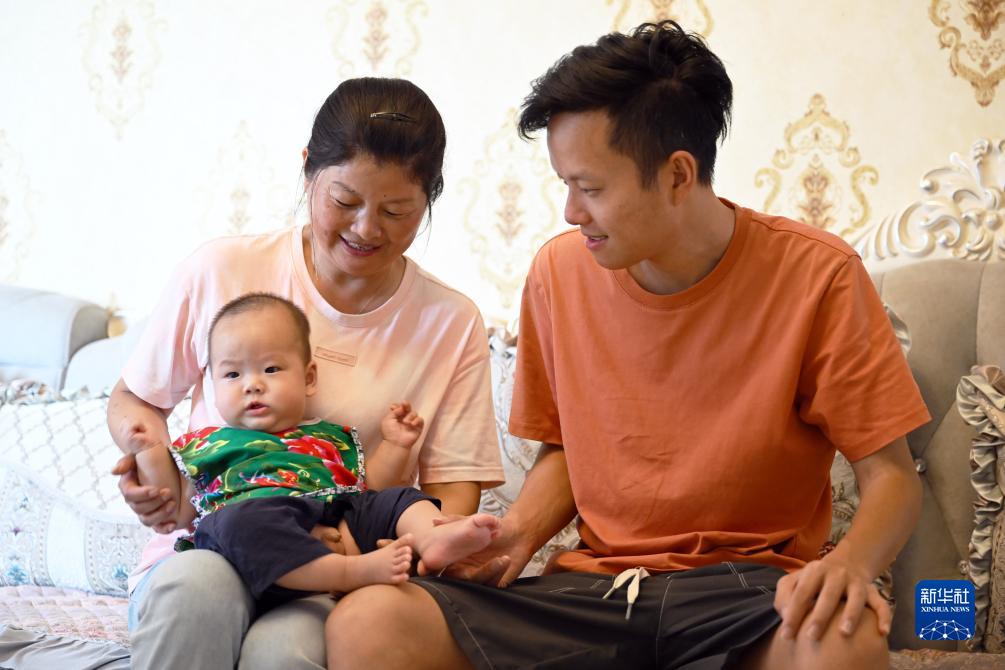 7月24日,陈兰香和儿子张成伟、孙子张锦亦在上岸后的新家里。新华社记者 周牧 摄