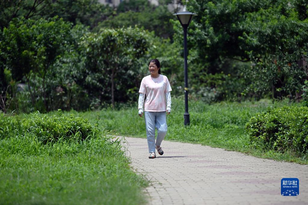 7月24日,陈兰香在上岸后新家所在的小区里散步。新华社记者 周牧 摄
