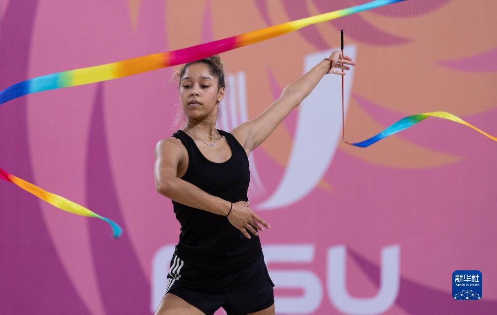 7月25日,南非大学生艺术体操队的选手在成都体育学院体操馆训练。
