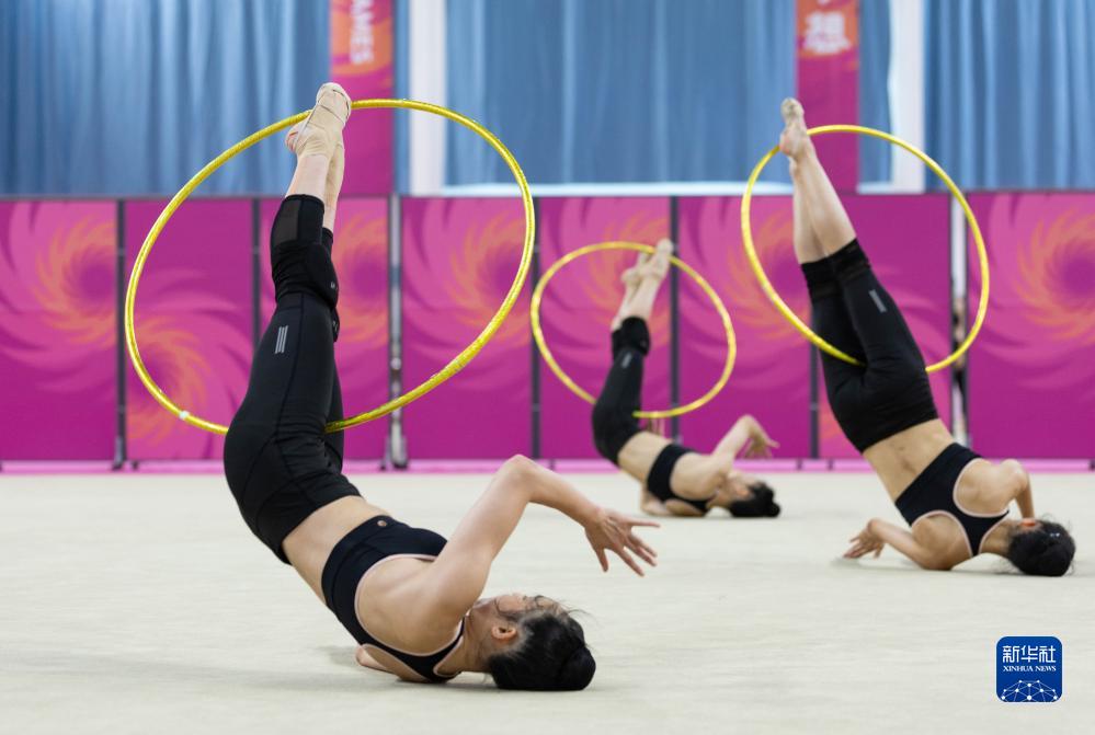 7月25日,中国大学生艺术体操队的选手们在成都体育学院体操馆训练。
