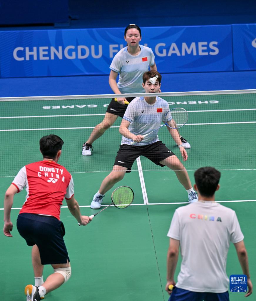 7月25日,中国代表团选手在双流体育中心体育馆进行羽毛球赛前训练。