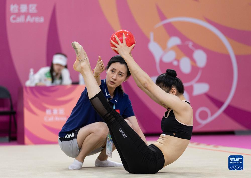 7月25日,成都大运会中国大学生艺术体操队集体项目主教练任爽(左)在成都体育学院体操馆指导队员训练。