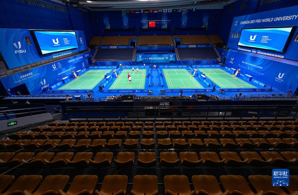 7月25日,中国代表团选手在双流体育中心体育馆进行羽毛球赛前训练。