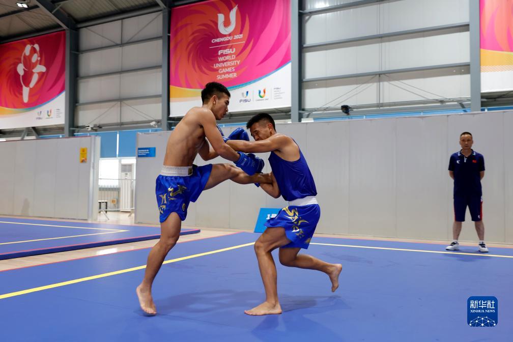 7月25日,参加第31届世界大学生夏季运动会武术散打比赛的中国选手在成都城北体育馆训练。