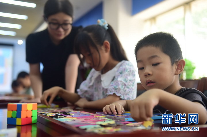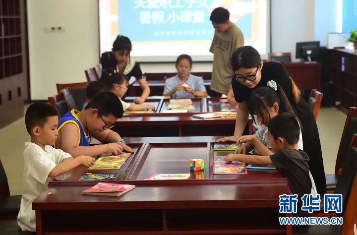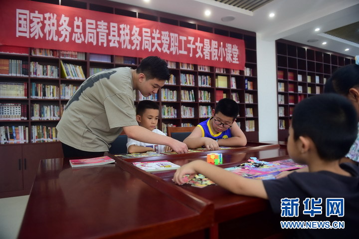 暑假期间,国家税务总局河北青县税务局在机关读书室举办关爱职工子女暑假小课堂,招募返乡大学生组建小课堂志愿服务队伍,根据孩子们的兴趣活动开展绘画、手工制作、安全教育、心理交流等课程。新华网发(张悦 摄)