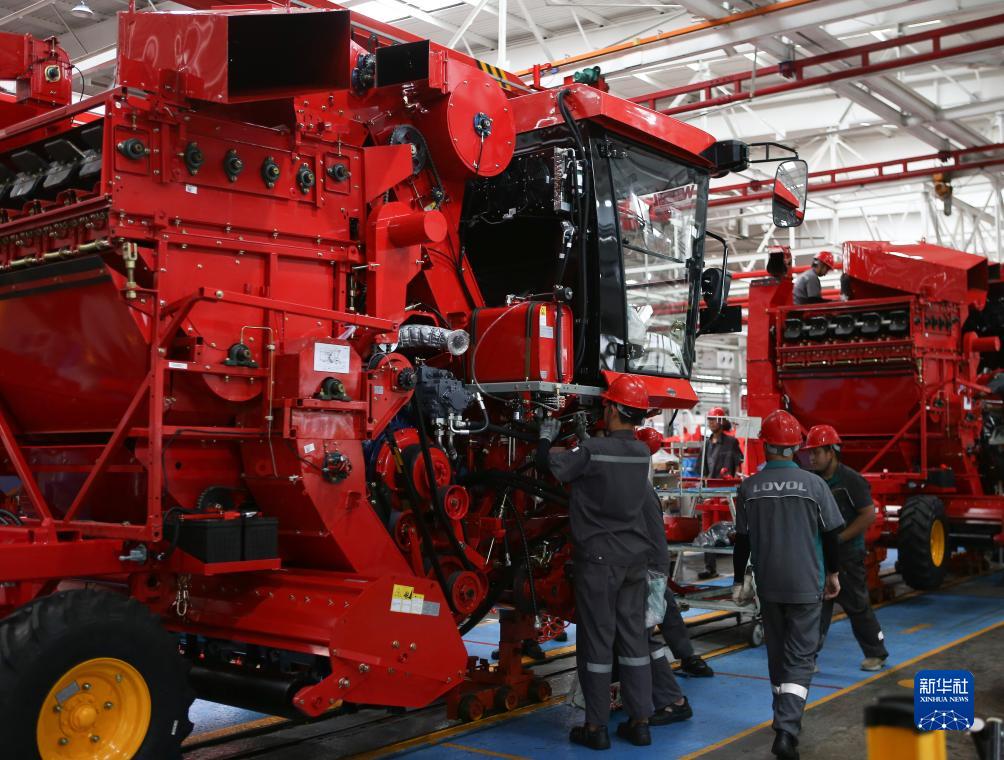 7月26日,在位于潍坊市的潍柴雷沃智慧农业科技股份有限公司,工人在车间组装玉米收割机。