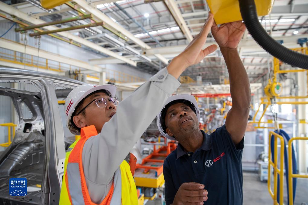 5月9日,在南非东开普省北汽南非工厂,邦加尼(右)与中国同事方龙在焊装车间内工作。