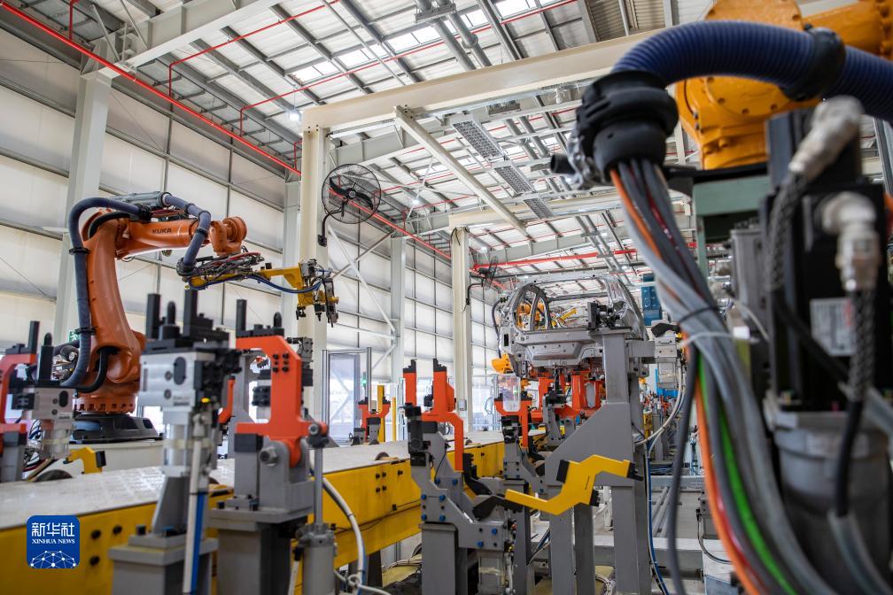 这是5月9日在南非东开普省北汽南非工厂拍摄的焊装车间生产线。