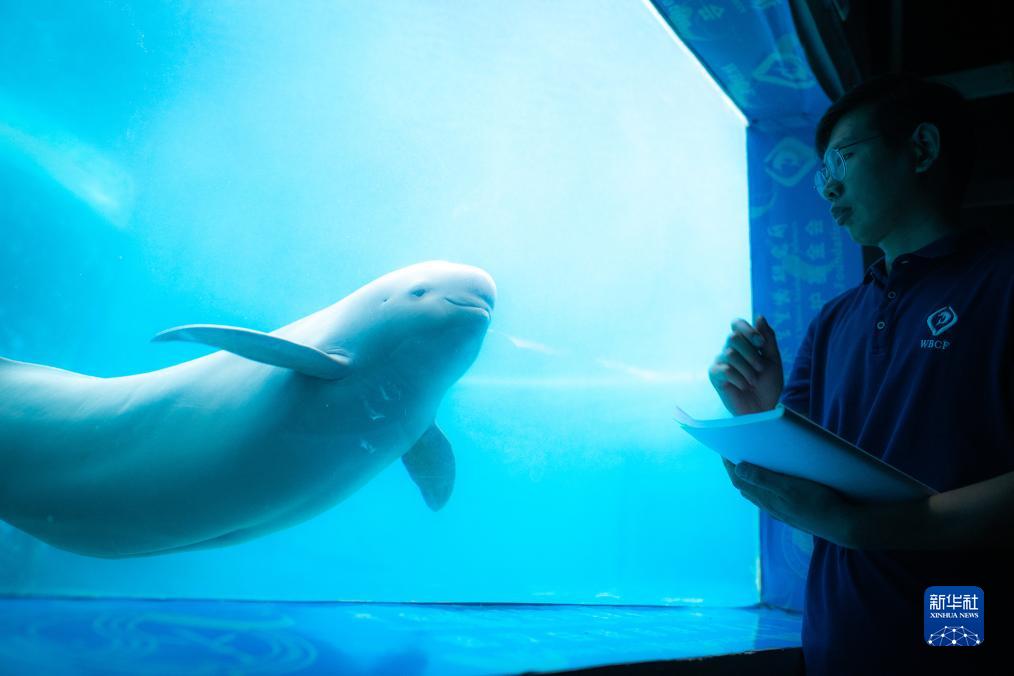 7月5日,中国科学院水生生物研究所白鱀豚馆训练员邓正宇对一头长江江豚进行观察。