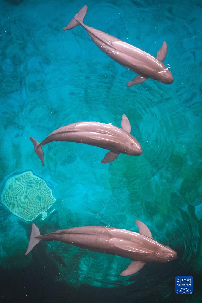 6月29日,三头长江江豚在白鱀豚馆水中游动。