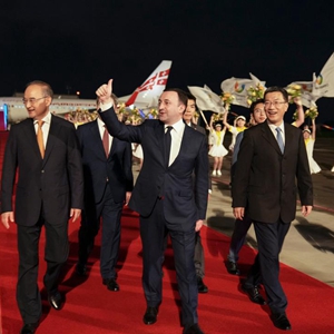 7月26日晚,来华出席成都大运会开幕式并访问的格鲁吉亚总理加里巴什维利抵达四川省成都市。新华社记者 江宏景 摄