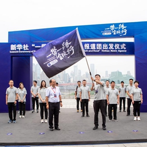 7月26日,在重庆市举行的新华社“一带一路全球行”报道团队出发仪式上,领队在挥舞旗帜。