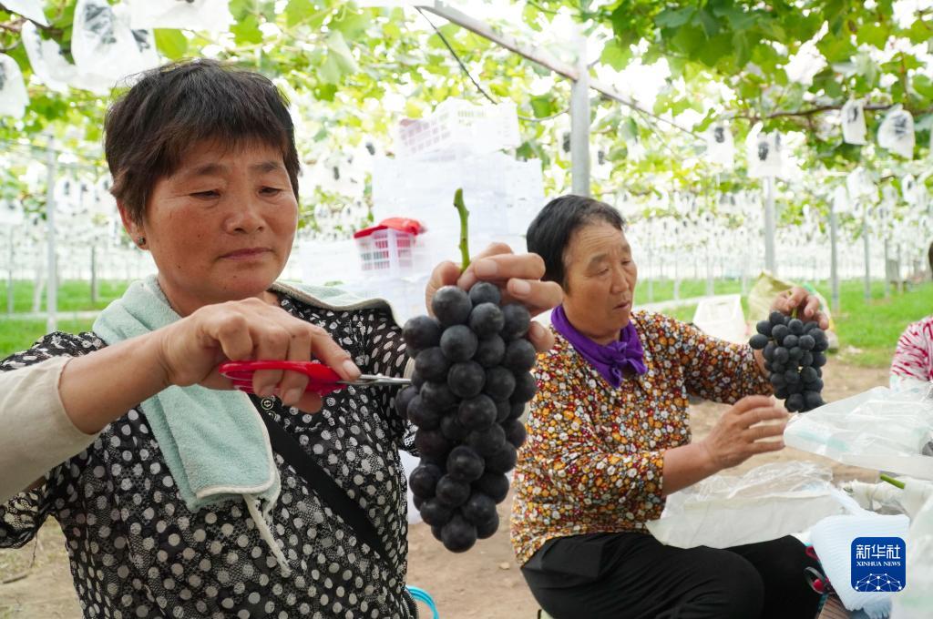 7月26日,在山东省新泰市楼德镇,果农在高标准葡萄大棚里对刚收获的葡萄进行检查、去坏果、装箱。